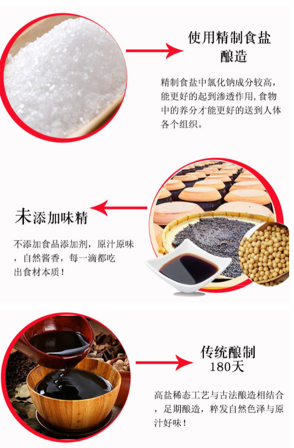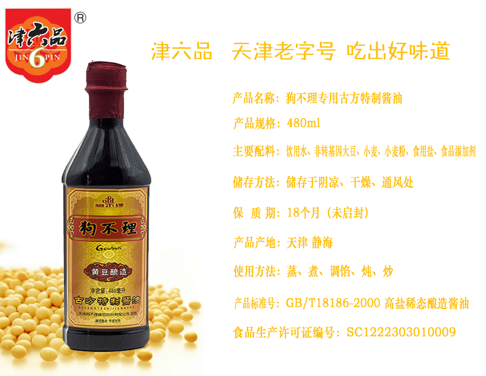 津六品狗不理专用古方特制酱油480ml 产品名称:狗不理专用古方特制酱油 产品规格:480ml 主要配料:饮用水、非转基因大豆、小麦、小麦粉、食用盐、食品添加剂 储存方法:储存于阴凉、干燥、通风处 保持期:10个月(使用后请即盖好瓶盖) 产品产地:天津 静海 食用方法:蒸、煮、调馅、炖、炒 产品标准号:GB/T18186-2000高盐稀态酿造酱油 食品生产许可证编号:SC1222303010009 津六品狗不理专用古方特制酱油精选东北非转基因脱脂大豆为原料,小麦粉、麸皮为辅料。高盐稀态发酵精制而成。色泽红亮,味道咸甜适口,价格经济实惠,是调馅和烹制菜肴的理想帮手。 酱油在我国生产历史已有上千年,近代明朝大医学家李时珍,对酱油的制造方法有着详细的记述,他在名著《本草纲目》中写道“大豆酱法”:用豆炒磨成粉,一斗入面三斗,和匀切片,罨黄晒之,每十斤入盐五斤,井水淹过,晒成收之。 一级压榨酱油是由从事酱油生产40年的国家酱油釀造技师,传承历史特有的古法酿造技术:“日晒夜露”之法演生而来;主要配料:精选优质东北大豆、优质小麦。大豆经过筛选颗粒饱满、无虫、无杂;小麦带壳炒制,破粒,大豆蒸熟,混合培养制曲,后拌盐加水制成稀醪之态,入地缸发酵,白天经太阳晒制升温,夜晚封缸发酵,即:“日晒夜露”之法,历经“三伏”、“三九”时间长达一年,发酵成熟后,将酱醪装袋压榨,取头榨头油(一级酱油),经高温灭菌、沉淀后得到:一级压榨鲜酱油。其特点为:豉香浓郁、色泽红润、味道鲜美和谐、体态澄明、风味独特,是酒店、家庭、调味、调馅、烹调上选之佳品。